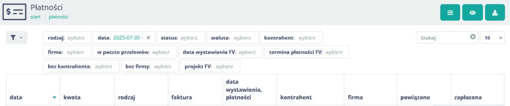 Aby wszystkie płatności widoczne były na tej liście, muszą być one dodane w fakturach. Dotychczas tworzenie płatności do faktury było opcjonalne, a same płatności mogła opiewać na dowolne części faktury. To oczywiście jest zachowane, ale możliwa jest taka konfiguracja systemu, by płatności do faktur dodawały się samoczynnie, na całą jej wartość w terminie płatności faktury. W takim podejściu wszystkie płatności są widoczne na odświeżonej liście i można nimi zarządzać hurtowo, alternatywnie do zarządzania z poziomu cashflow.