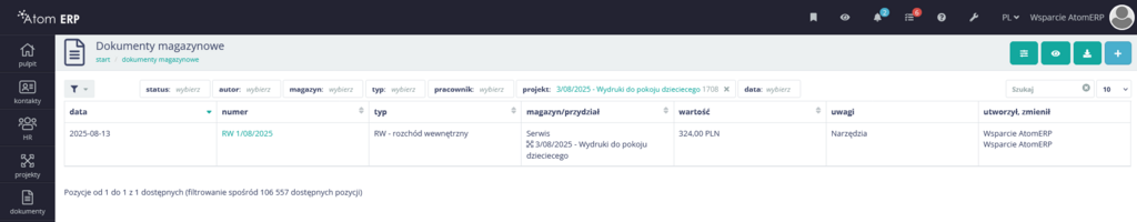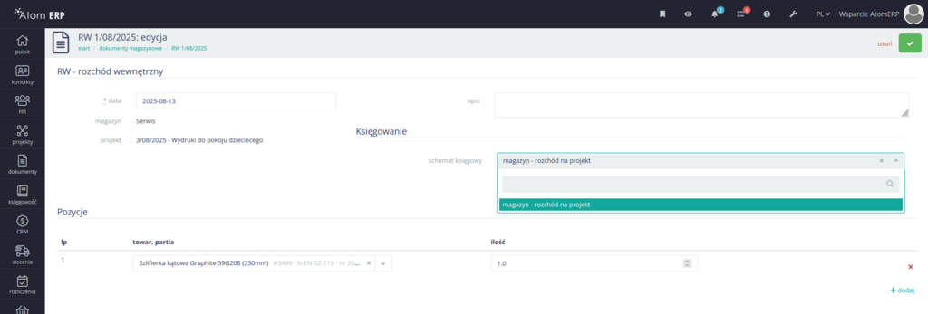 Atom ERP zapewnia możliwość księgowania faktur, przelewów, dowolnych dokumentów finansowych (korekt, not, itp.) czy wypłat i wynagrodzeń. Teraz do tej grupy dołączają dokumenty magazynowe. Można teraz zakupić towar i bez opisywania go projektem przyjąć na magazyn, a dopiero w momencie wydania z magazynu na konkretny cel opisać rozchód i go zaksięgować. Tym sposobem analiza kosztów projektów jest jeszcze pełniejsza i łatwiejsza, bo każdy zużyty z magazynu towar można przypisać do wybranego projektu.