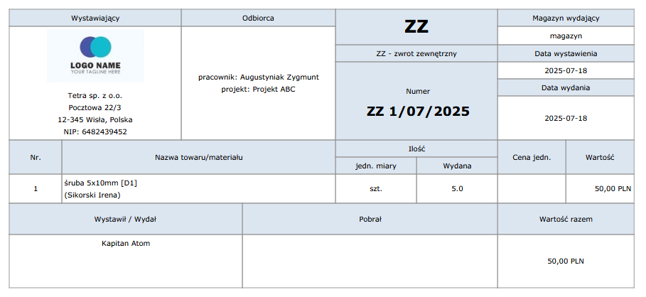 Lista obsługiwanych w Atom ERP rodzajów dokumentów magazynowych rozszerzyła się o kolejną pozycję. Dokument zwrotu zewnętrznego pozwala skorygować dokument przyjęcia zewnętrznego, czyli jeśli przyjęto jakiś towar od dostawcy, a później go zwrócono, można to udokumentować dokumentem ZZ.